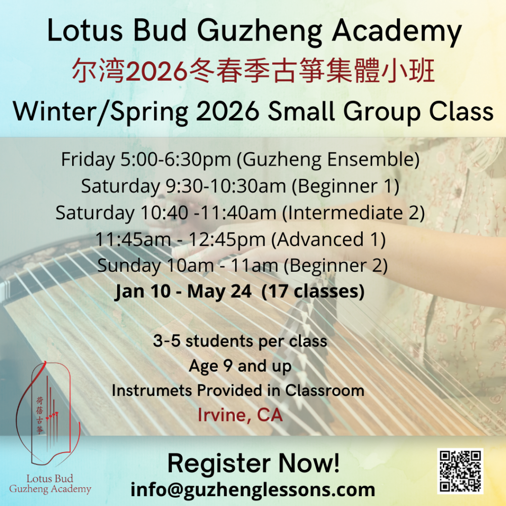 Lotus Bud Guzheng Academy offers small group classes for beginners and improvers. We also offer Guzheng Ensemble class for students who like to perform. 尔湾荷蓓古箏學院提供古箏初級入門小班、提高班以及箏樂團的課程。